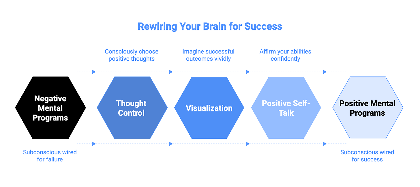 Every thought, visualization, and internal conversation programs your subconscious mind. Negative self-talk and mental rehearsal of failure literally wire your brain for poor performance. Your repeated mental patterns become your automatic responses.