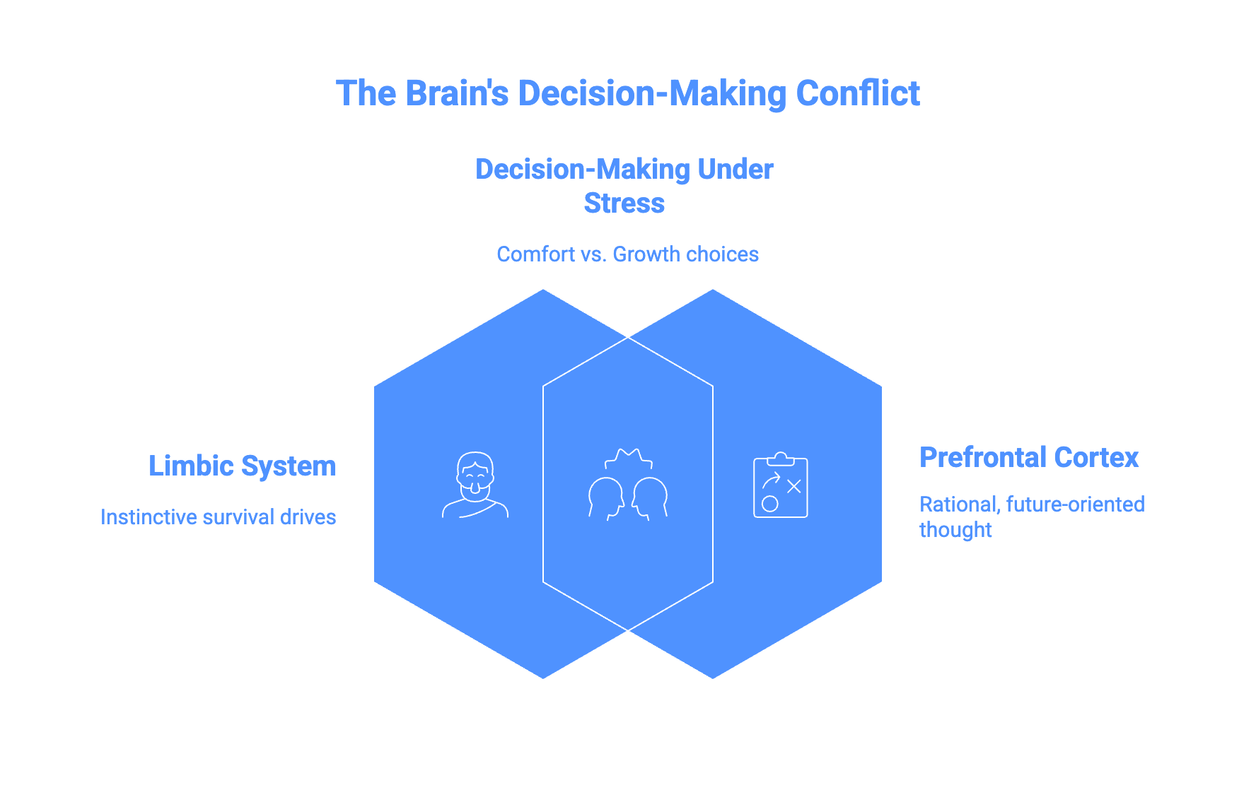 The prefrontal cortex handles reasoning, planning, delayed gratification. Growth lives here. So does discipline. But this system is slower, requires more energy, and gets overridden under stress.